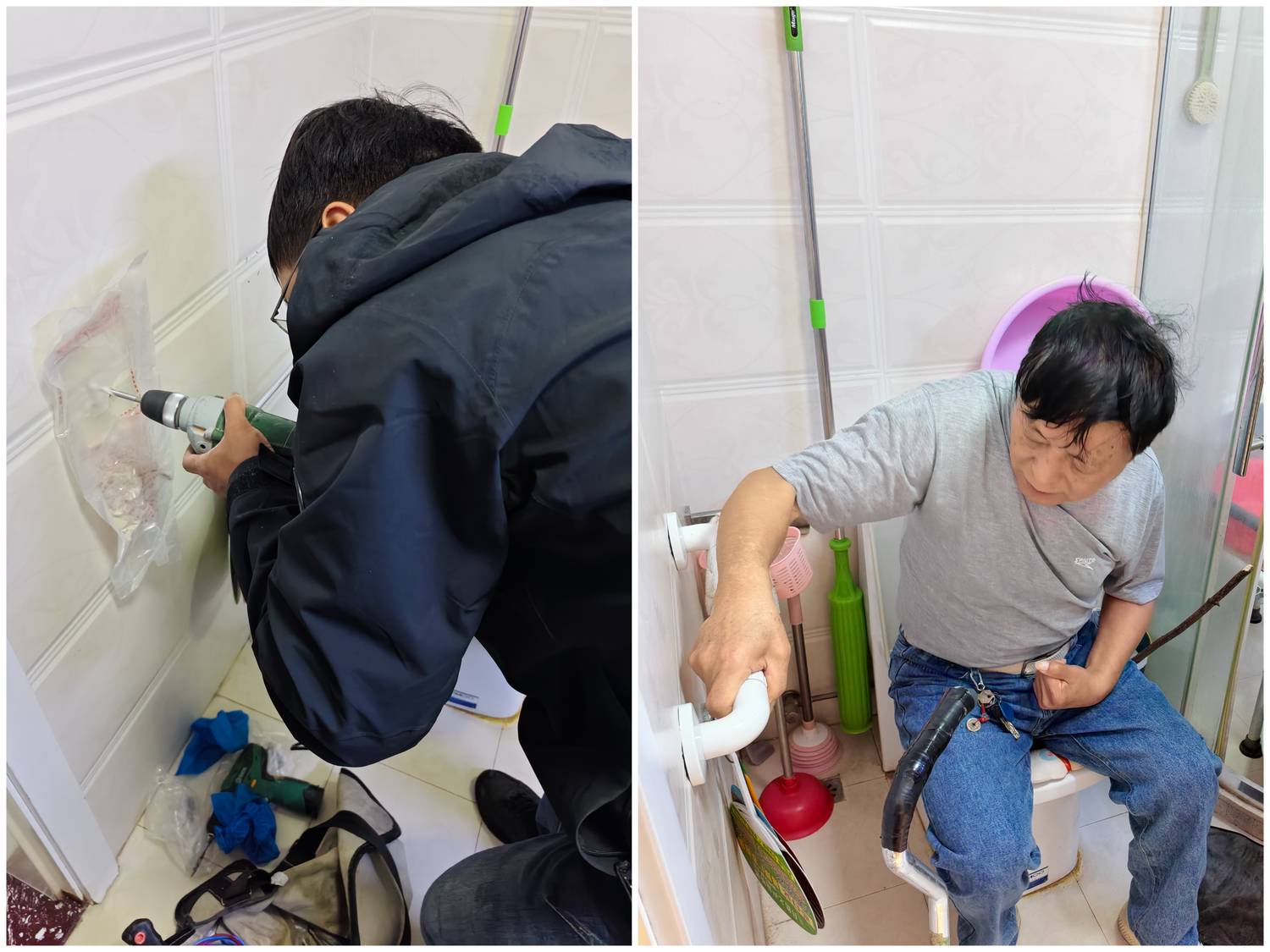 为针对性解决黄师傅的日常生活困扰,社区社工当即启动了“红色代办”服务,代为黄师傅向上级部门申请常规适老化无障碍扶手安装,但由于条件所限未能通过审批。对此,社区并没有放弃的,而是迅速转变工作思路,将目光投向更为广阔的社会慈善资源网络。社区通过积极对接共建爱心单位,很快便为黄师傅定制采购了符合其身体情况和居家条件的专用扶手。安装当日,虽然大雨滂沱,社区与爱心单位的工作人员亦冒雨赶赴黄师傅家中,如约上门进行扶手安装服务,测量、定位、钻孔、固定……每一个步骤都细致认真,确保扶手安装得牢固、稳妥。