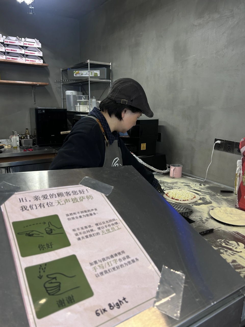 在海曙区鼓楼街道文昌街之上,一家坐落于市井巷尾的名为“6ix8ight”的披萨店人头攒动,其创新推出的“咸齑牛肉披萨”得到了广大消费者的追捧与喜爱,然而,许多光顾的熟客都知道,这家店的“招牌”不仅只在于这份勾引舌尖的味蕾,更在一份无声的温暖之中——开放式厨房内,一位手法娴熟的听障面点师正专注地揉搓着面团、铺撒馅料,十指轻捻间,仿佛勾勒着一曲动人心弦的“无声交响”,成为这家小店最动人的风景。